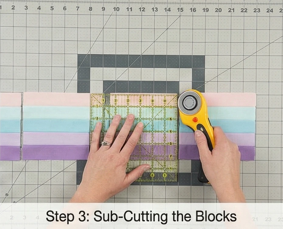 - Cut: Take your strip sets to the cutting mat. Cut them vertically into 5-inch-wide segments.