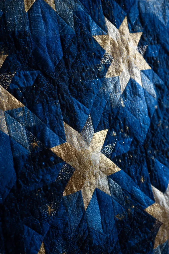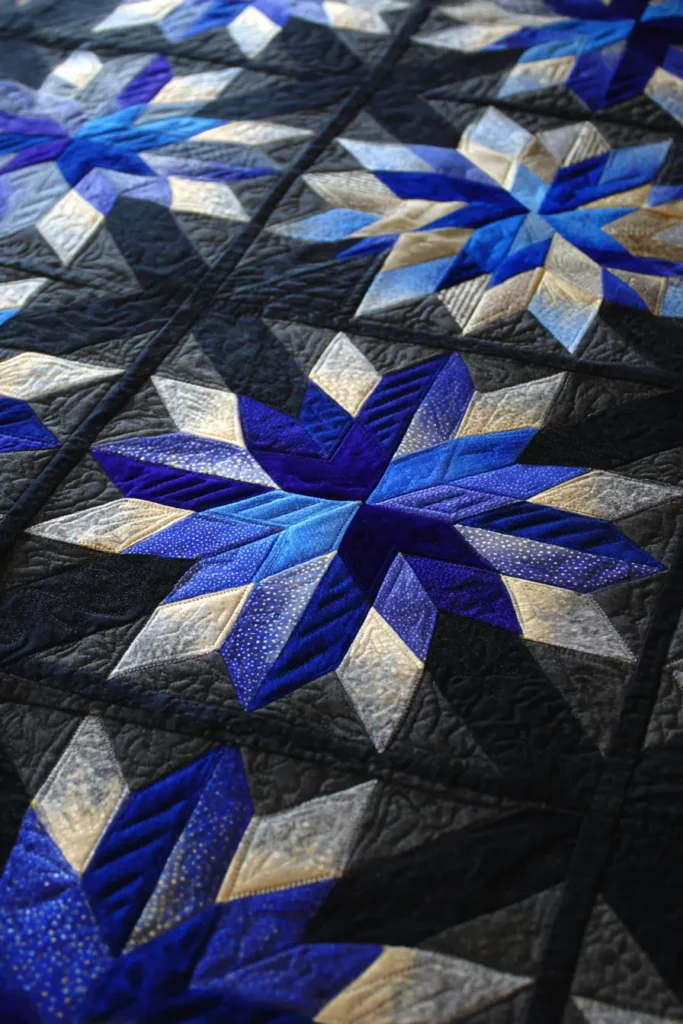 Cut large diamond shapes to construct a massive, singular “Barn Star” or “Lone Star” that spans the entire width of the quilt. Utilizing oversized geometric pieces minimizes the number of stiff seams, allowing the heavy fabric to drape fluidly over your body rather than standing rigid.