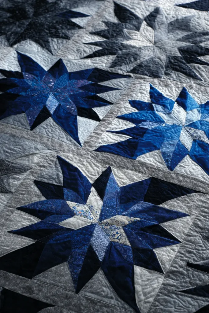 Cut oversized triangles to create massive 18 or 24-inch “Sawtooth Star” blocks, which significantly reduces the number of bulky seams. Fewer seams mean the fabric remains flexible and fluid, allowing the quilt to drape softly over your body rather than feeling stiff or board-like.