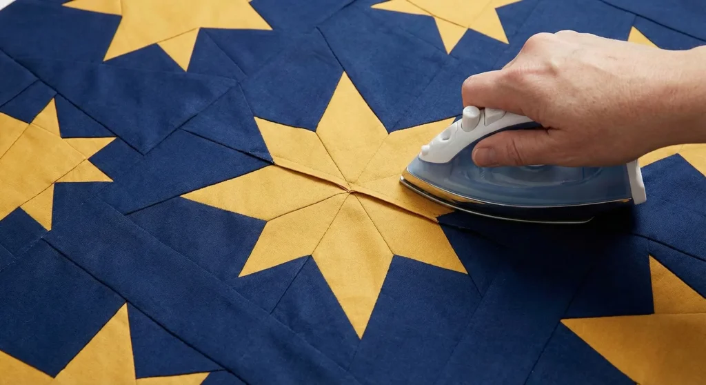 As you join the eight diamond or triangle points in the center, “spin” or fan the seam allowances open on the back rather than pressing them all to one side. This crucial technique completely flattens the center intersection, eliminating the complex, lumpy “volcano” of fabric that is annoying to lie on.