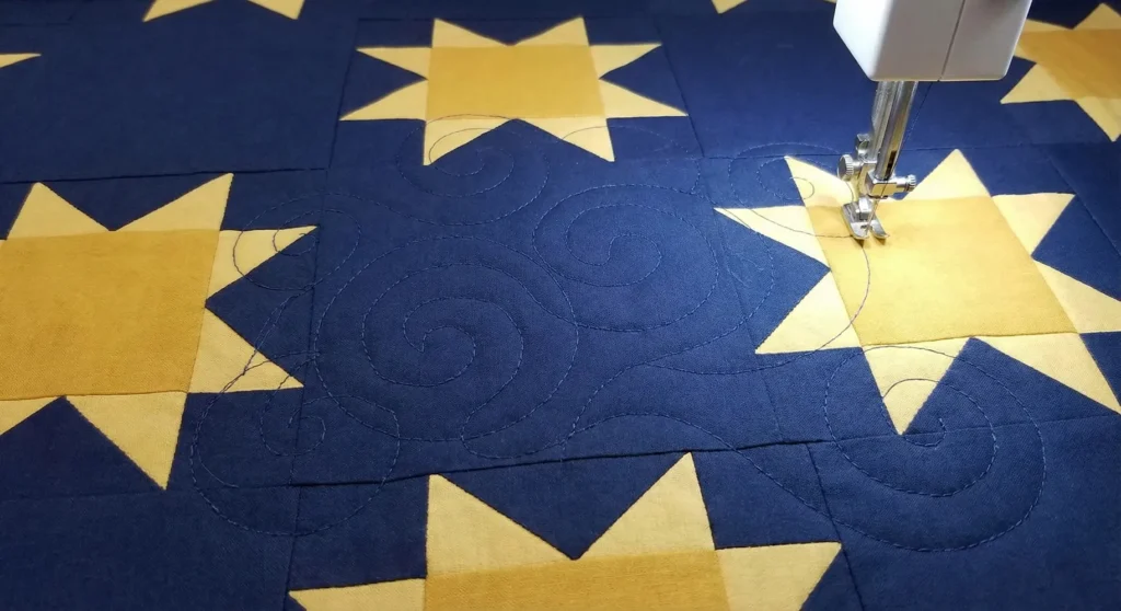 Instead, use a “stitch-in-the-ditch” technique along the seam lines, or use widely spaced straight lines across the quilt. This minimal approach secures the heavy layers effectively while ensuring the quilt remains pliable, soft, and drapeable.