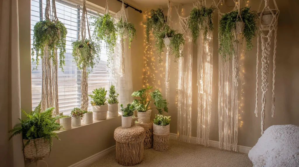 This boho macrame hanging plant corner transforms a neglected nook of the bedroom into a lush, free-spirited oasis, where cascading greenery dangles from intricate handmade macrame hangers in soft ivory and earthy tones, creating layers of texture that sway gently with the breeze from an open window. Potted ferns, trailing pothos, and succulent vines spill over the edges, their vibrant leaves contrasting against a neutral wall painted in warm beige, evoking a sense of wanderlust and tranquility perfect for unwinding with a book or scrolling through social media. A woven rattan stool tucked below holds a few ceramic pots and a small essential oil diffuser emitting hints of lavender, while fairy lights woven through the macrame add a subtle, magical glow at dusk, making the space feel alive, personalized, and effortlessly trendy for a Gen-Z vibe that blends nature with bohemian charm.