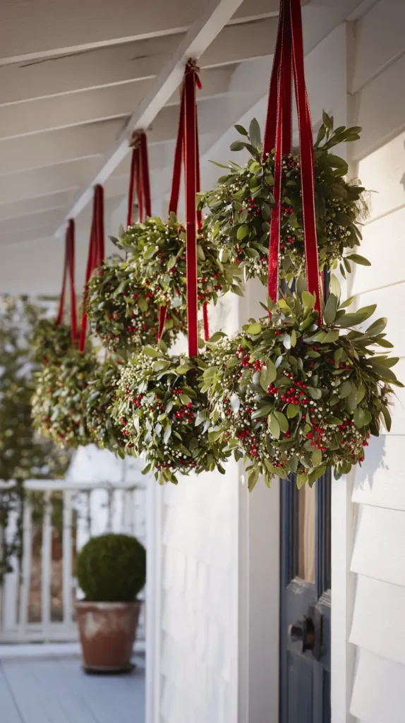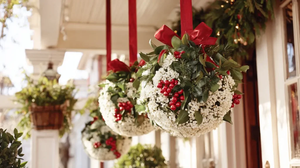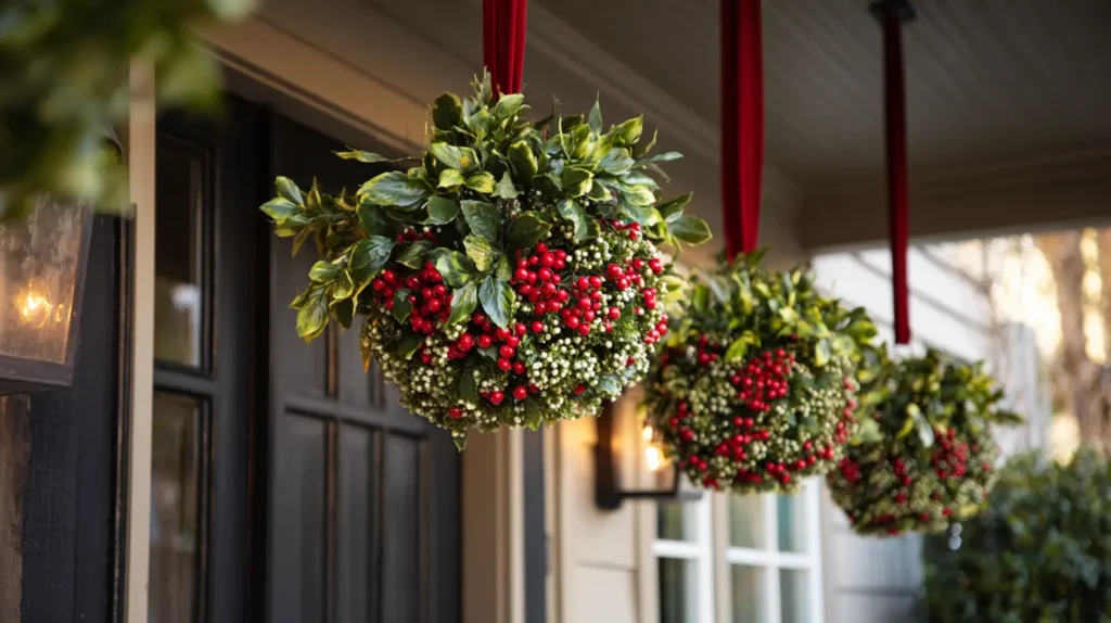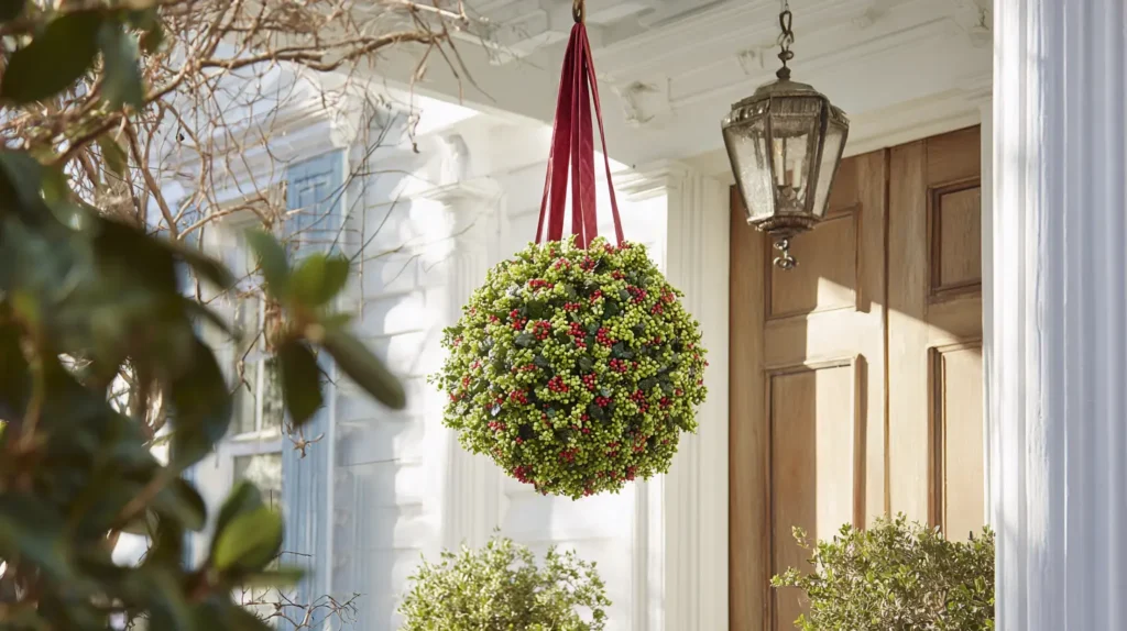 Pro Design Tip: Create a cluster effect for a grander entrance. Instead of one lonely ball, hang three kissing balls of slightly different sizes at staggered heights in a corner of the porch or directly above the welcome mat. This looks like a floating art installation rather than just a single holiday accessory.