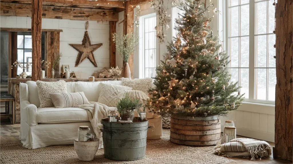 Forget the fussy, wrinkled fabric skirt. For a true farmhouse look, anchor your tree with something solid and textural. Envision the base of your Christmas tree encircled by a rustic, galvanized metal tree collar, as if it’s sitting in a large, old farm bucket. It’s simple, grey metallic sheen reflects the tree lights in a soft, diffused way. It provides a clean, contained, and slightly industrial-chic finish that perfectly complements the rustic wood and greenery, hiding the tree stand and completing the “fresh from the farm” look.