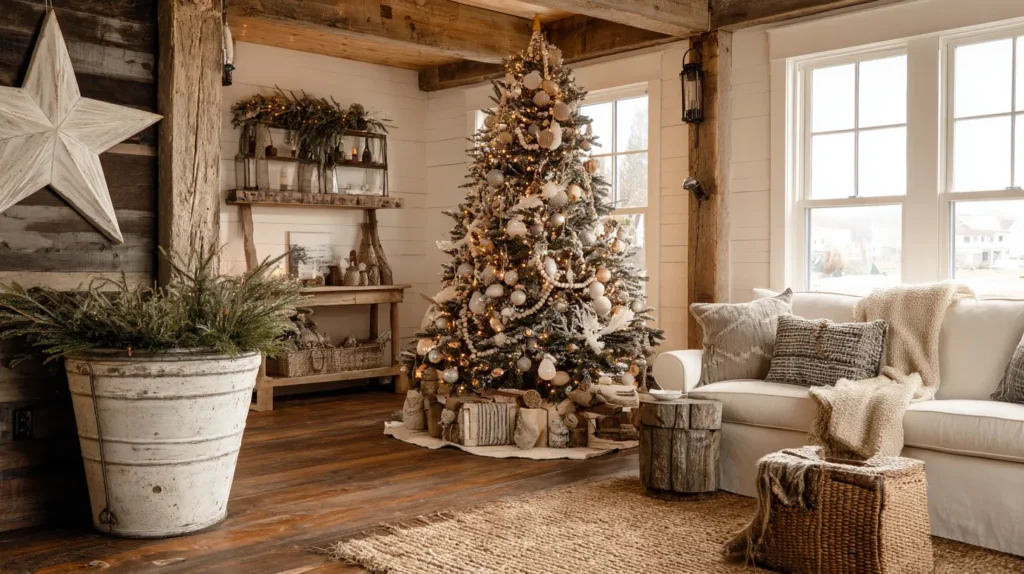 Pro Design Tip: Instead of a traditional fabric skirt, place your tree in a large galvanized metal bucket, a rustic wooden crate, or a woven wicker basket to complete the “fresh from the farm” look.
